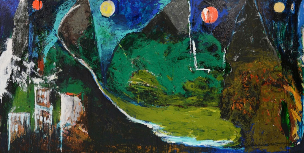 Le opere d’arte contemporanea in questa mostra si possono ricondurre all’acqua, al mare e alla montagna solo in termini simbolici, concettuali, o di pretesto e occasione per parlare di mondi che a questi elementi in qualche modo fanno riferimento. Questo Mario Schifano (1934-1998), con una potenza evocativa raggiunta negli ultimi decenni forse solo da Anselm Kiefer, ci dà davvero il senso di quale fosse, in un impressionante volo della fantasia, la sua idea di fiume, di montagne, di città – la sua visione dell’Italia del Nord.