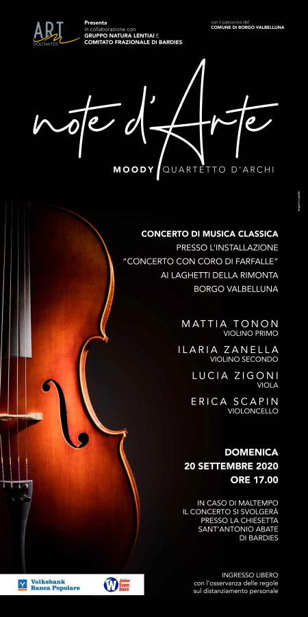 Art Dolomites vi invitia al concerto di musica classica Note d’arte presso l’opera “Concerto con coro di farfalle” nella splendida cornice dei Laghetti della Rimonta a Borgo Valbelluna.
